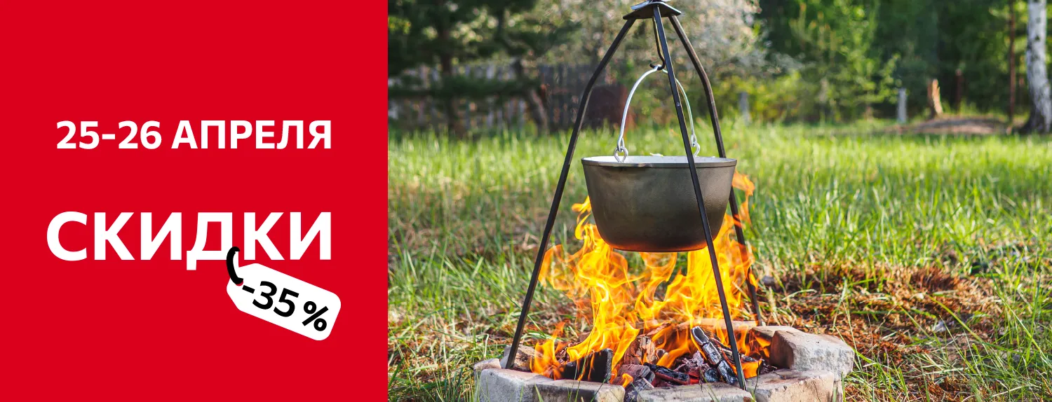 -35% на товары для туризма и отдыха: учаги и печи, мангалы и шампуры, треноги и саджи, коптильни, котлы и казаны походные;